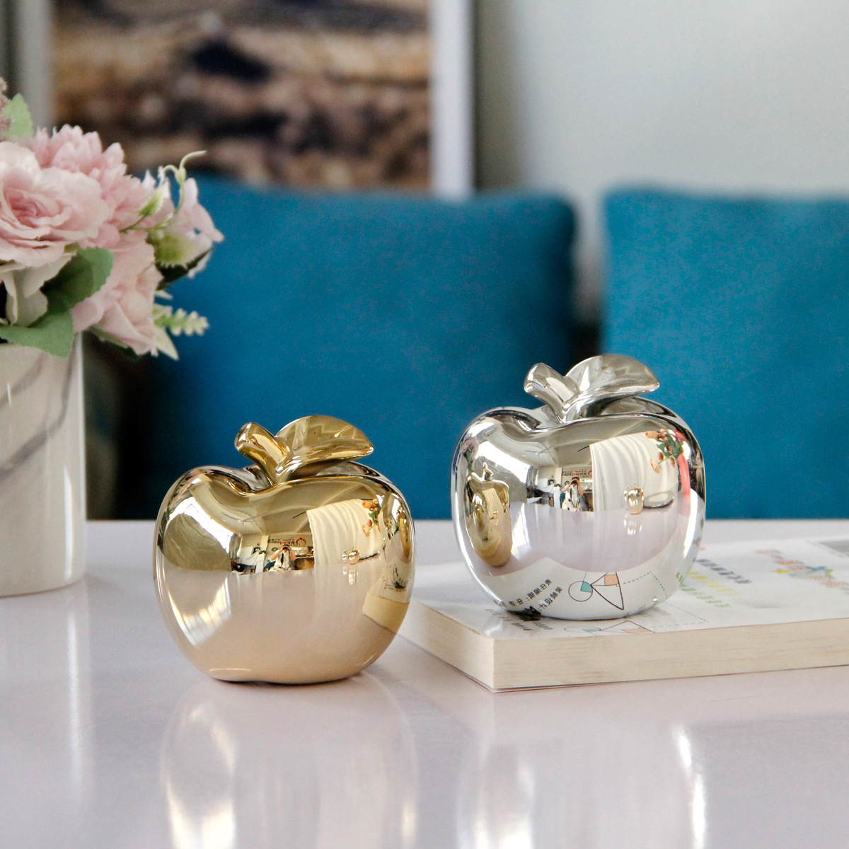 モダンなシンプルなヨーロッパスタイルの北欧風の家庭装飾品のアイデアクリスマスプレゼント金色の銀色のリンゴの陶磁器の置物