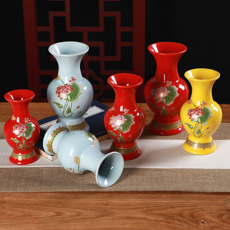 ハスの花を卸して仏陶磁器の花瓶の仏具の工芸品を提供します。