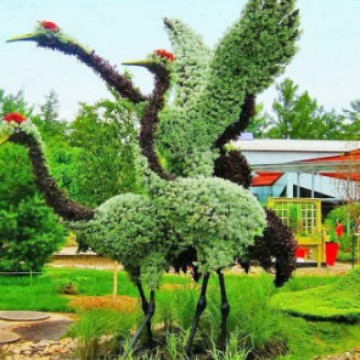 グリーンスカルプチャー工場 シャチョウ グリーンスカルプチャー公園風景 模造植物彫刻 河南市建設草 桜と樺の照明