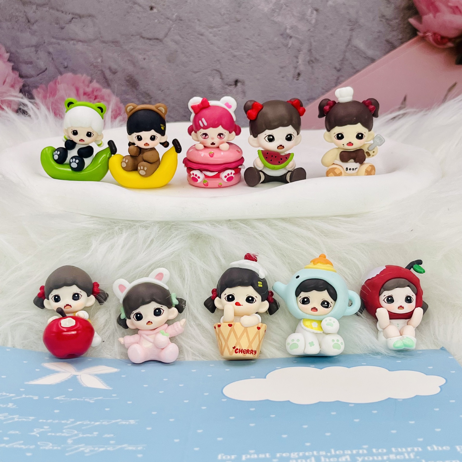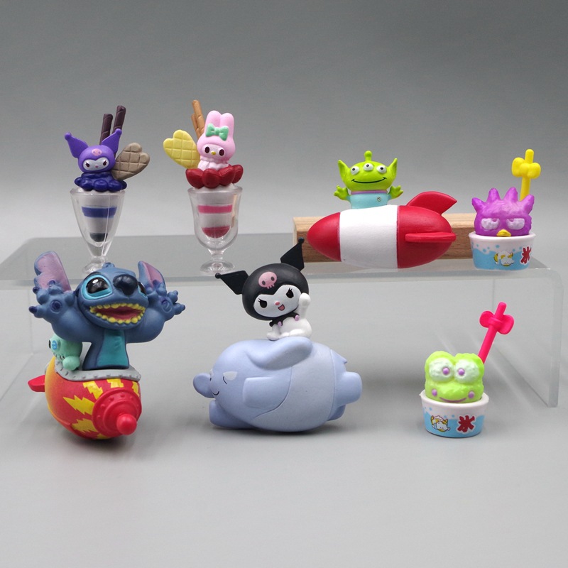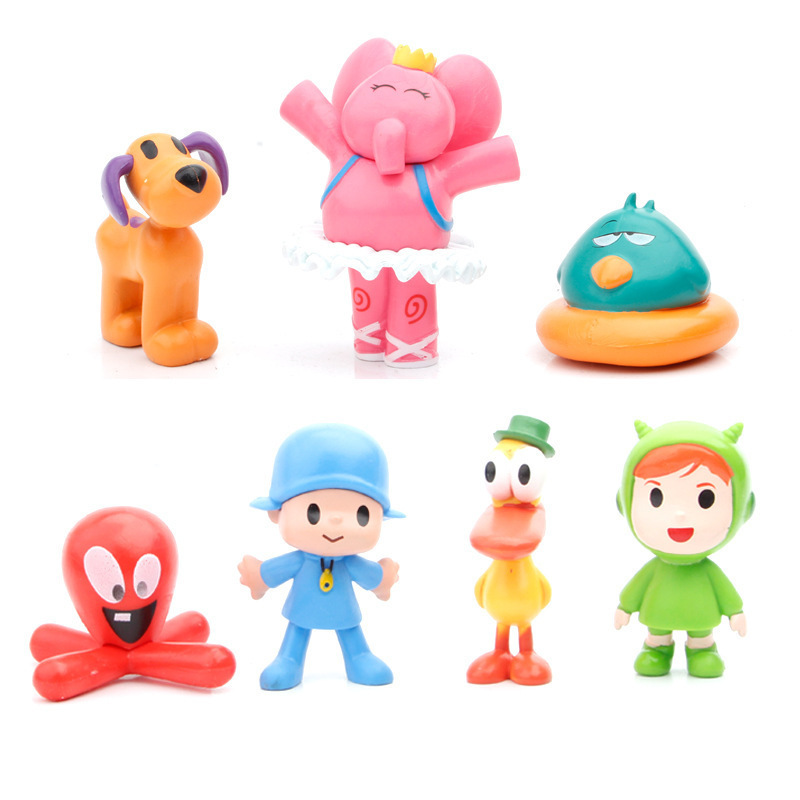7種類の小さいP優優の模型の手作りのケーキの車の上で部品の小さい私の子供のアニメのおもちゃのぬいぐるみを並べます。