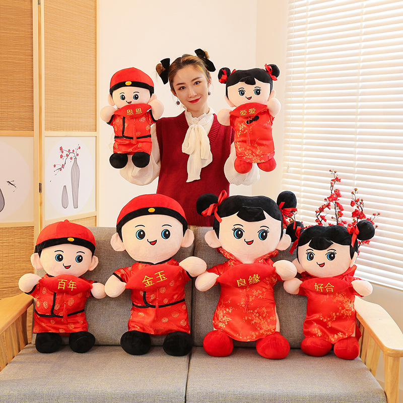 ウェディング用品新婚チャイナドレスシリーズのぬいぐるみは、中国式の結婚式の子供と金童玉女のペアです。