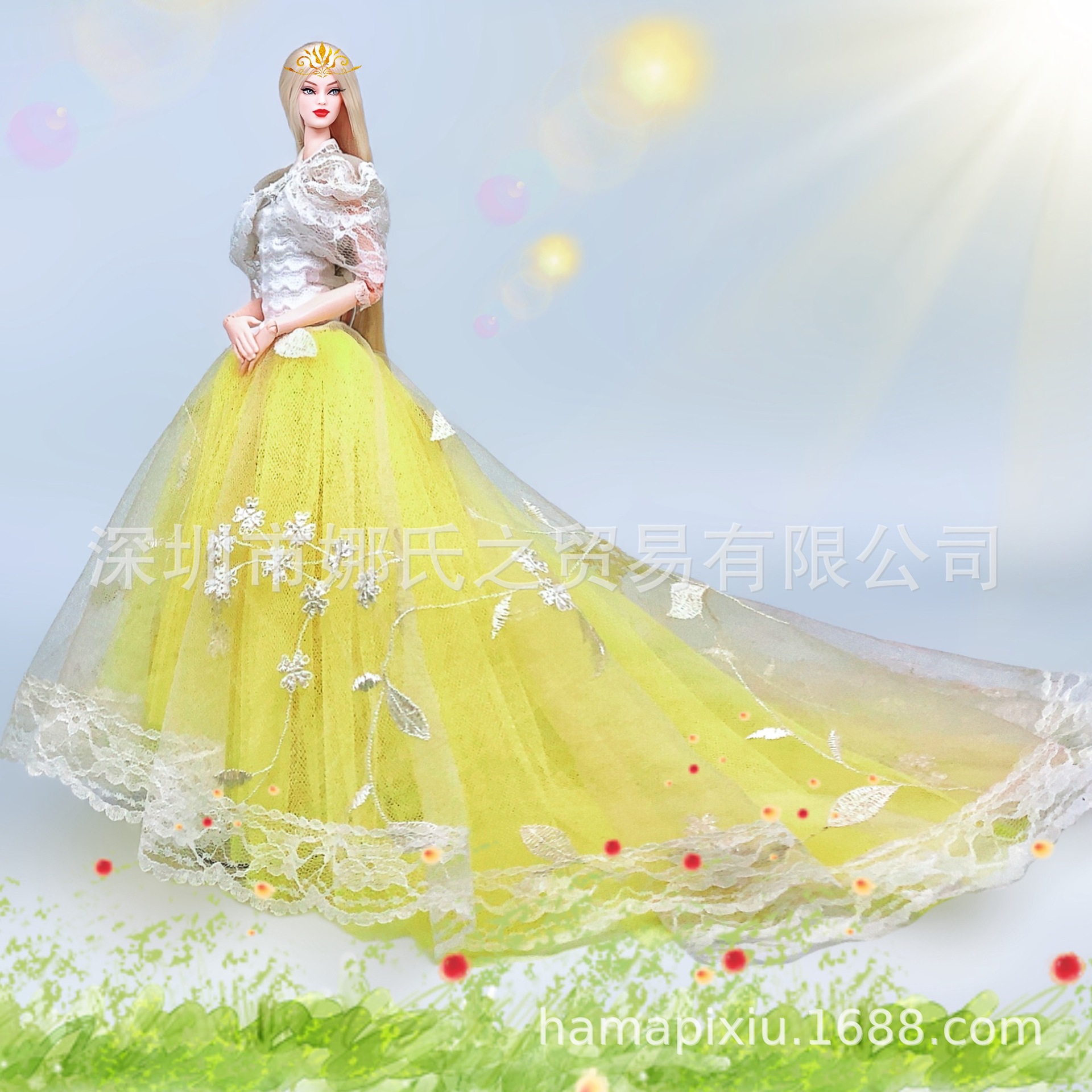 黄色の美人と野獣の尾引きのウェディングドレスはfr30センチの人形の服を交換します。