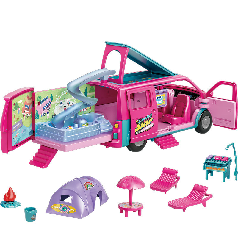 国境を越えた対外貿易オープンカーキャンプピクニックのテーマ車のままごとのおもちゃバスはドアを開けることができます。