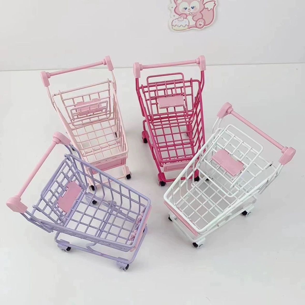 新型ins風ピンクかわいいショッピングカートのカートのテーブルにかわいいショッピングバスケットを飾ってテーブルに収納する