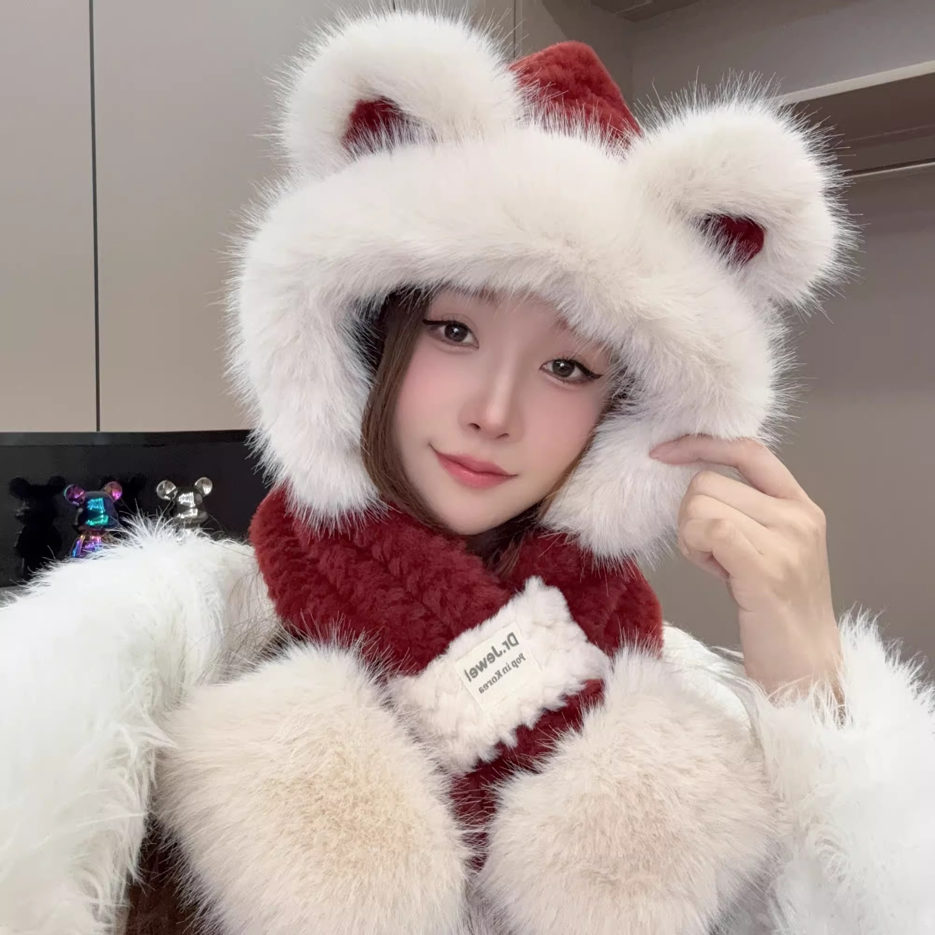 アンゴラ産の赤いぬいぐるみ風帽子、女性用、2025年冬新作、秋冬用、厚手で暖かい、スカーフと手袋が一体になったもの