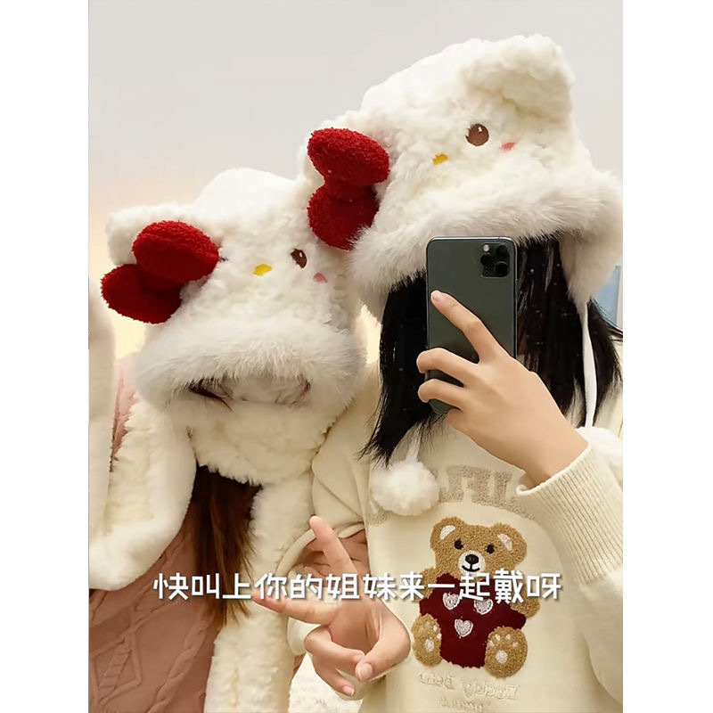 かわいいkt猫防寒帽子赤い蝶結びのぬいぐるみ秋冬の手袋マフラー帽子三合一保温女