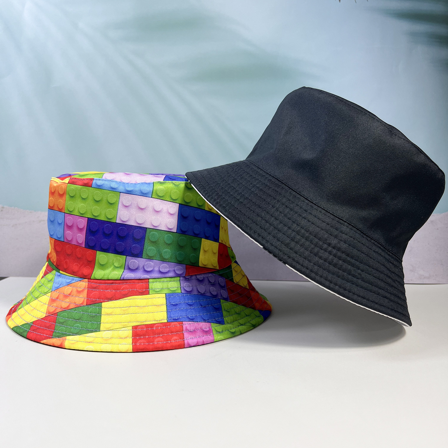 欧米の新型の積み木のプリントの漁師の帽子の女性の夏のカラーのプリントの両面は盆の帽子のカジュアルな百合の日焼け止めの帽子を持ちます。