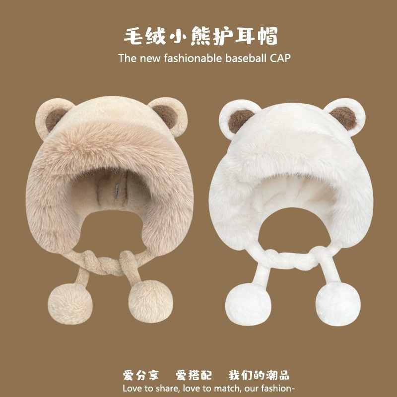 冬の女性のぬいぐるみかわいいベアー帽子保温ベルベット毛糸帽包頭耳保護帽防寒防風ニット帽