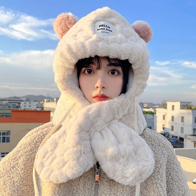 冬かわいいクマスカーフ帽子暖かいオールインワン帽子学生ラムウール韓国スタイルの女性の帽子マスクぬいぐるみ帽子