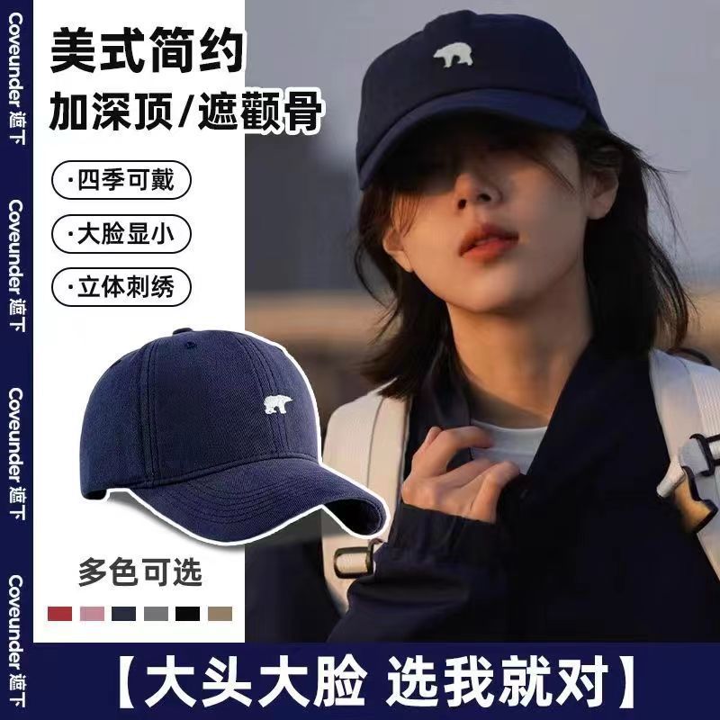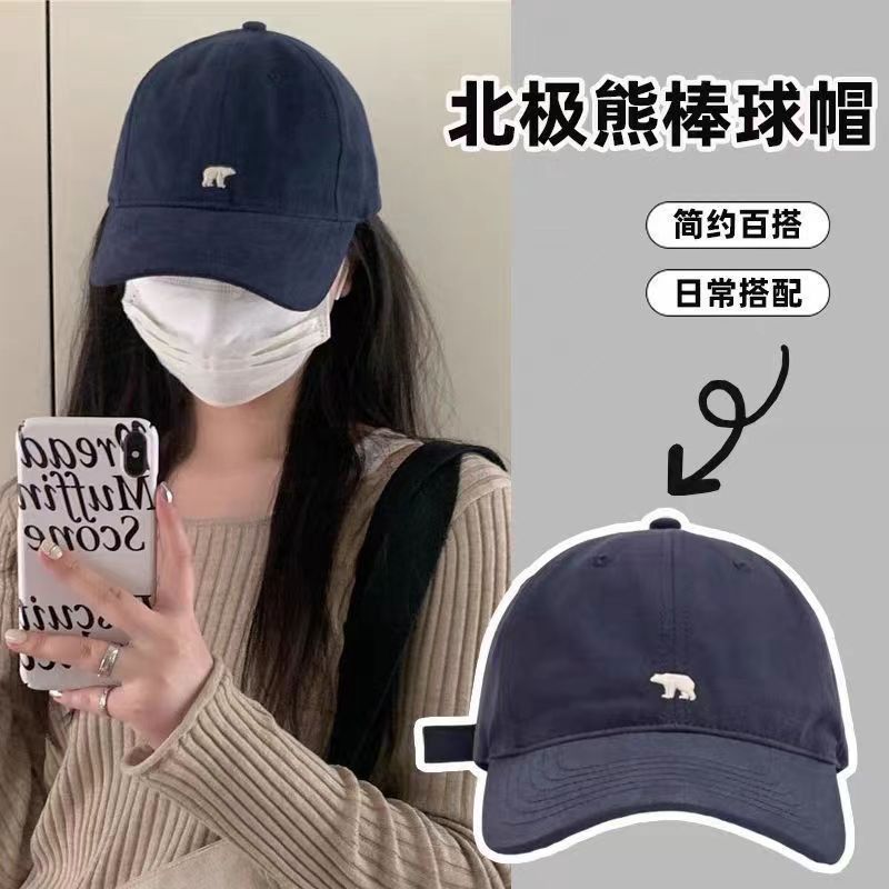 夏用野球帽、漫画風刺繍のシロクマ、顔が小さく見える、日韓風のカーブしたつばのキャップ、動物刺繍デザイン、日焼け防止