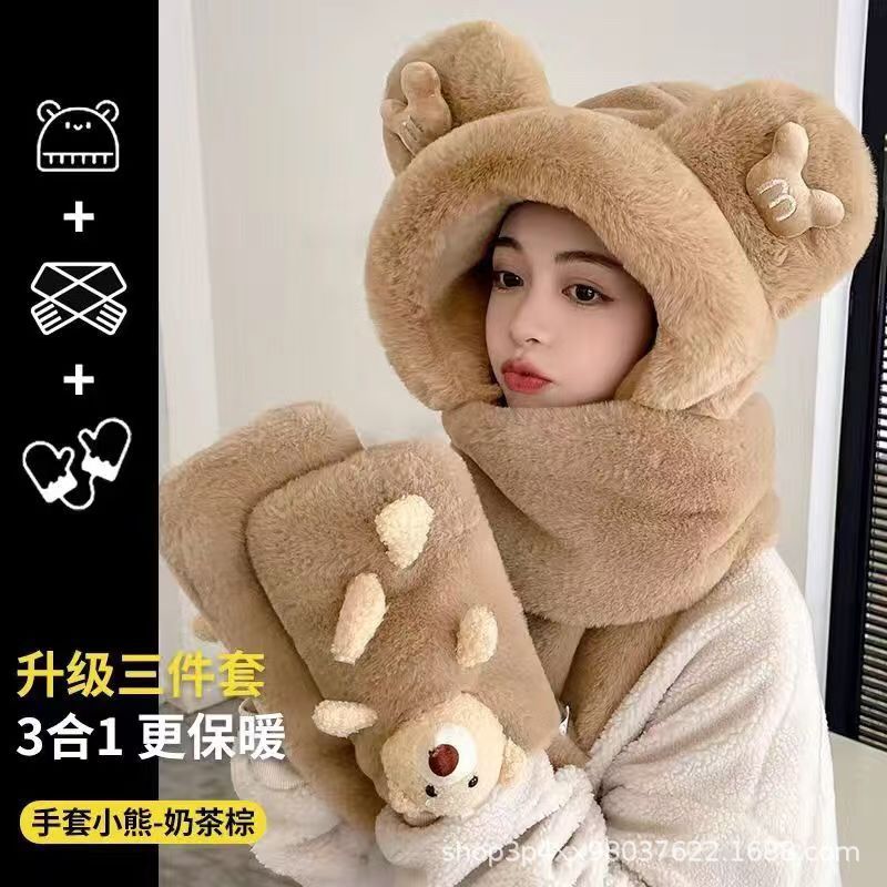 冬の暖かい帽子のマフラーの手袋の3つのセットの一体の韓国版の厚い保温のかわいいぬいぐるみの熊のマフラーの女性