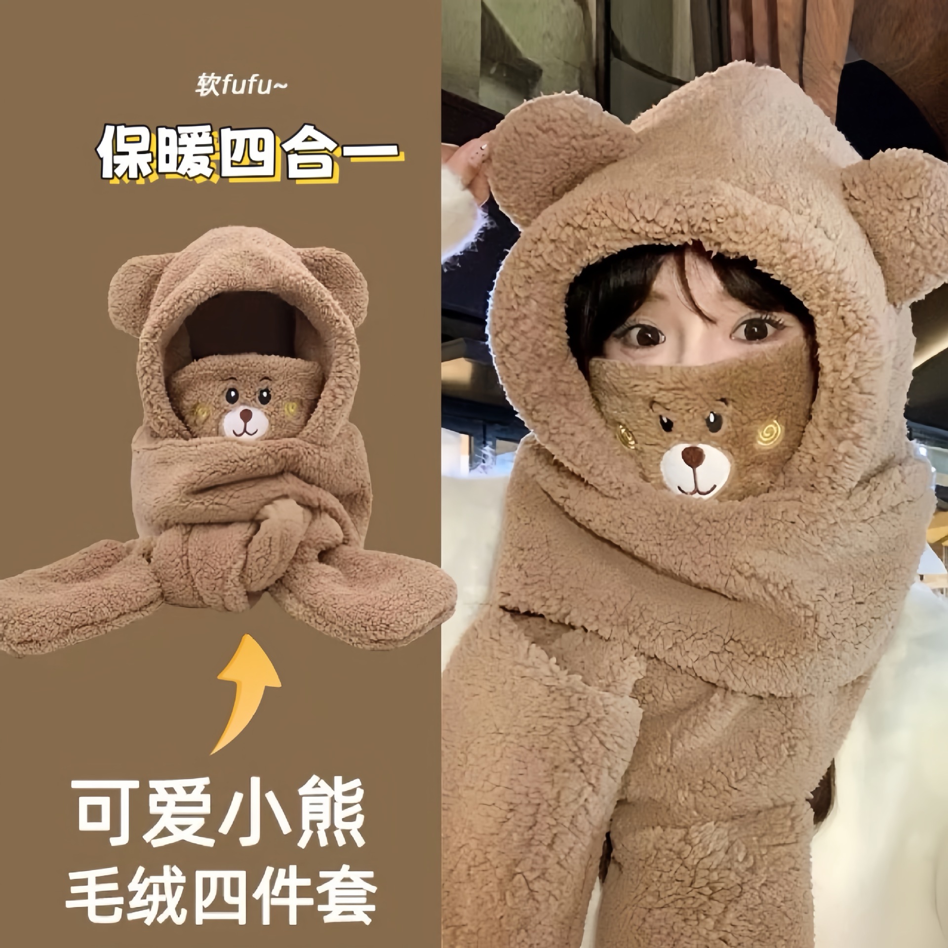 【保温五合一】ベア帽子・マフラー一体型 レディース 秋冬 学生 サイクリング用 ふわふわ保温耳当て帽子