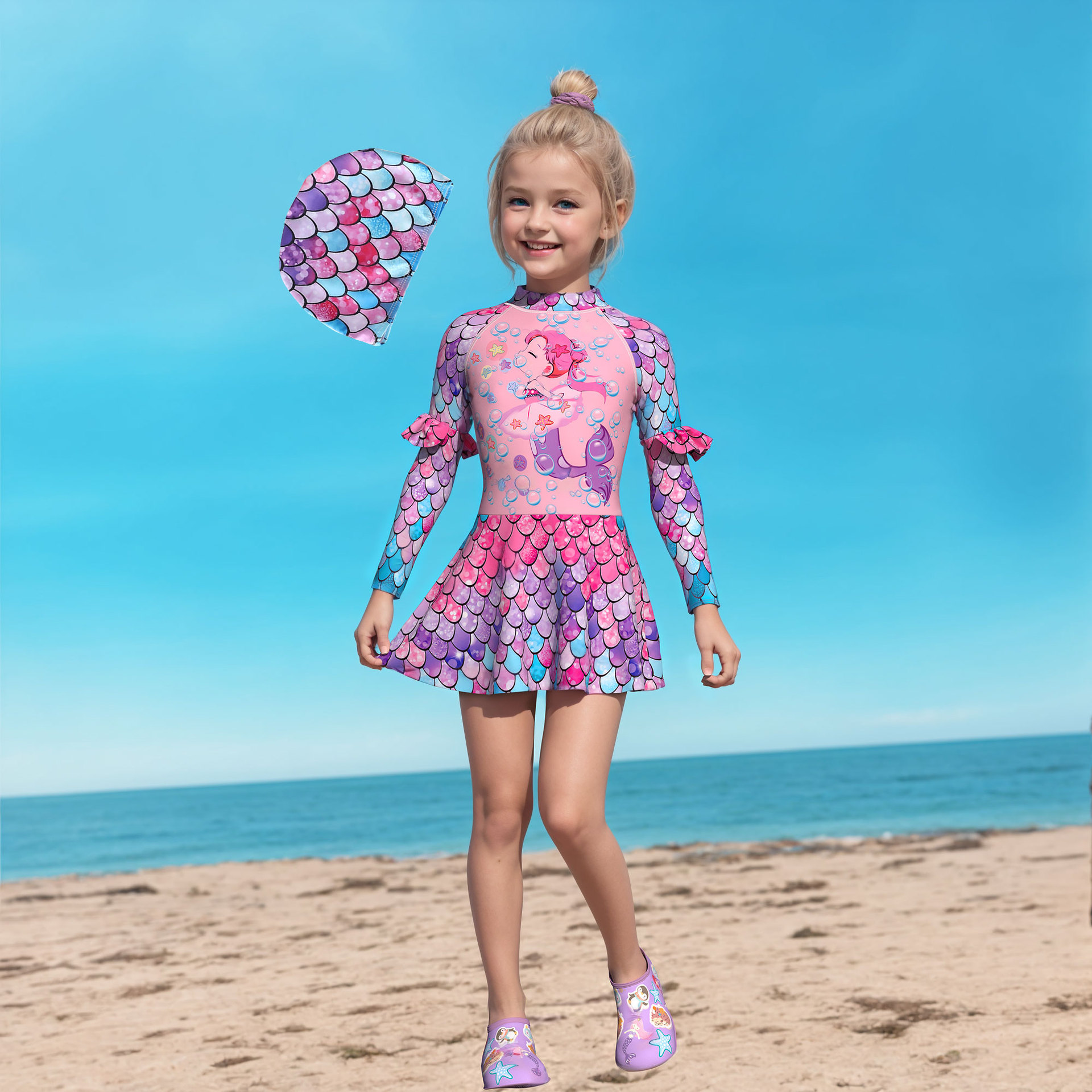 2024新しい子供の水着の女の子の水着の人魚のうろこの女の子の赤ちゃんの学生の長袖のズボンのワンピースの水着