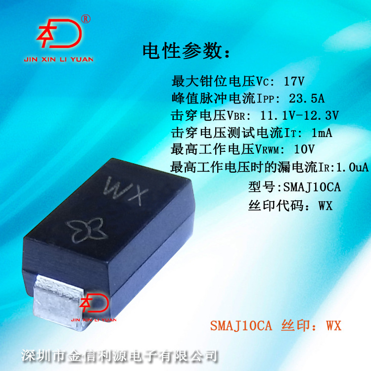 SMAJ10CA シルク スクリーン WX 双方向 TVS ダイオード | パッケージングSMA | 最大クランプ電圧 17V 電流 23.5A