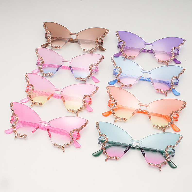 クロスボーダーの新しい蝶の形のダイヤモンドがちりばめられた女性用リムレスサングラス、ファッショナブルな個性、誇張されたサングラス、ヨーロッパとアメリカのインターネット有名人の砕いたダイヤモンド