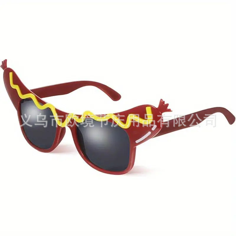 個性メガネのおかしなメガネの卸売りは地面にメガネのホットドッグのソーセージの形を並べてメガネのお笑いの道具を撮影します。