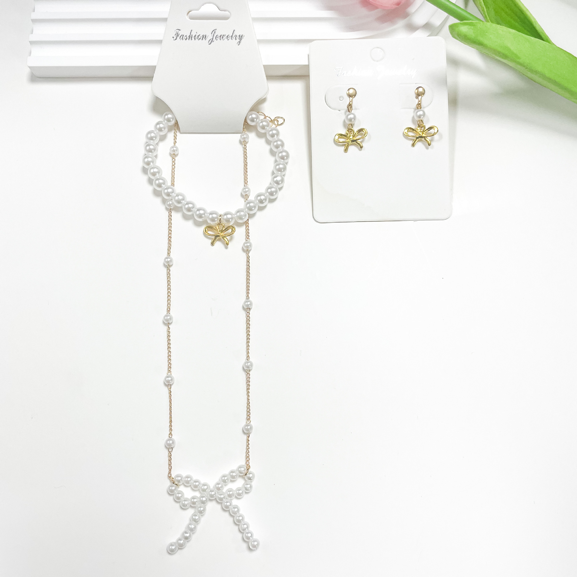 新しい可愛いシンプルなパールリボンジュエリーネックレスメタルイヤリングセット卸売ファッションガールズ