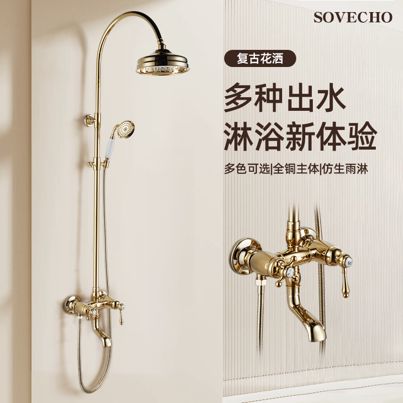 軽奢なフランス風真鍮製ゴールドシャワー、レトロな家庭用シャワー、温冷混合水栓、昇降式セット、バスルーム用