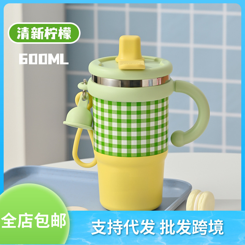 新しい大容量ダブルドリンクカップ、小さなアイスカップ、ファッショナブルなチェック柄のステンレス鋼魔法瓶カップ、女の子向けの見栄えの良いストローカップ