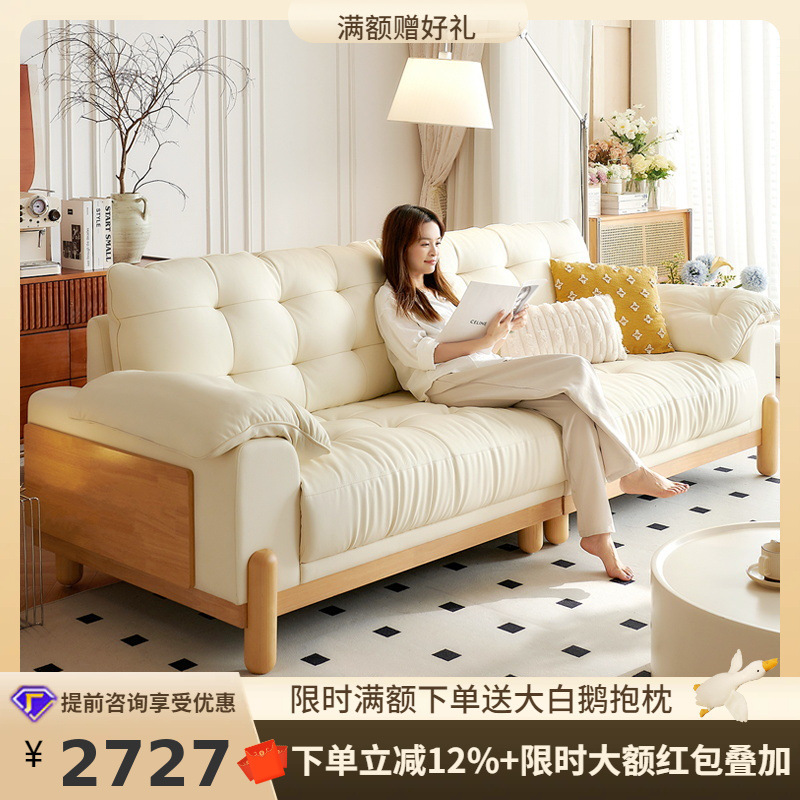 Tongyu ティーパフクラウドクリームログリビングルーム和風ストレート小型アパートメントマシュマロ無垢材レザーソファ