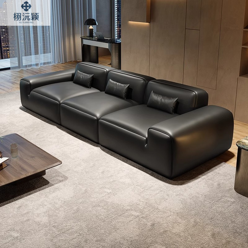 黒牛革製ソファ イタリア風ミニマリストリビング 小型マンション向け モダンライトラグジュアリー 直列型黒色3人掛けソファ