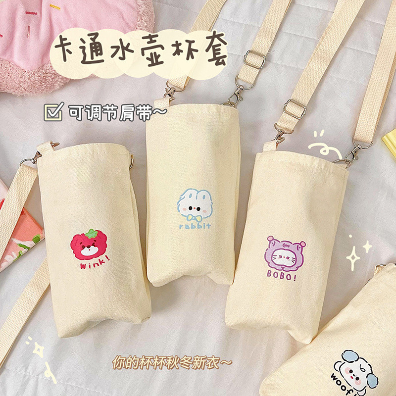かわいい漫画のポータブルウォーターカップバッグ、クロスボディカップカバー、ドーパミンカラーケトルバッグ、キャンバスウォーターカップ保護カバー