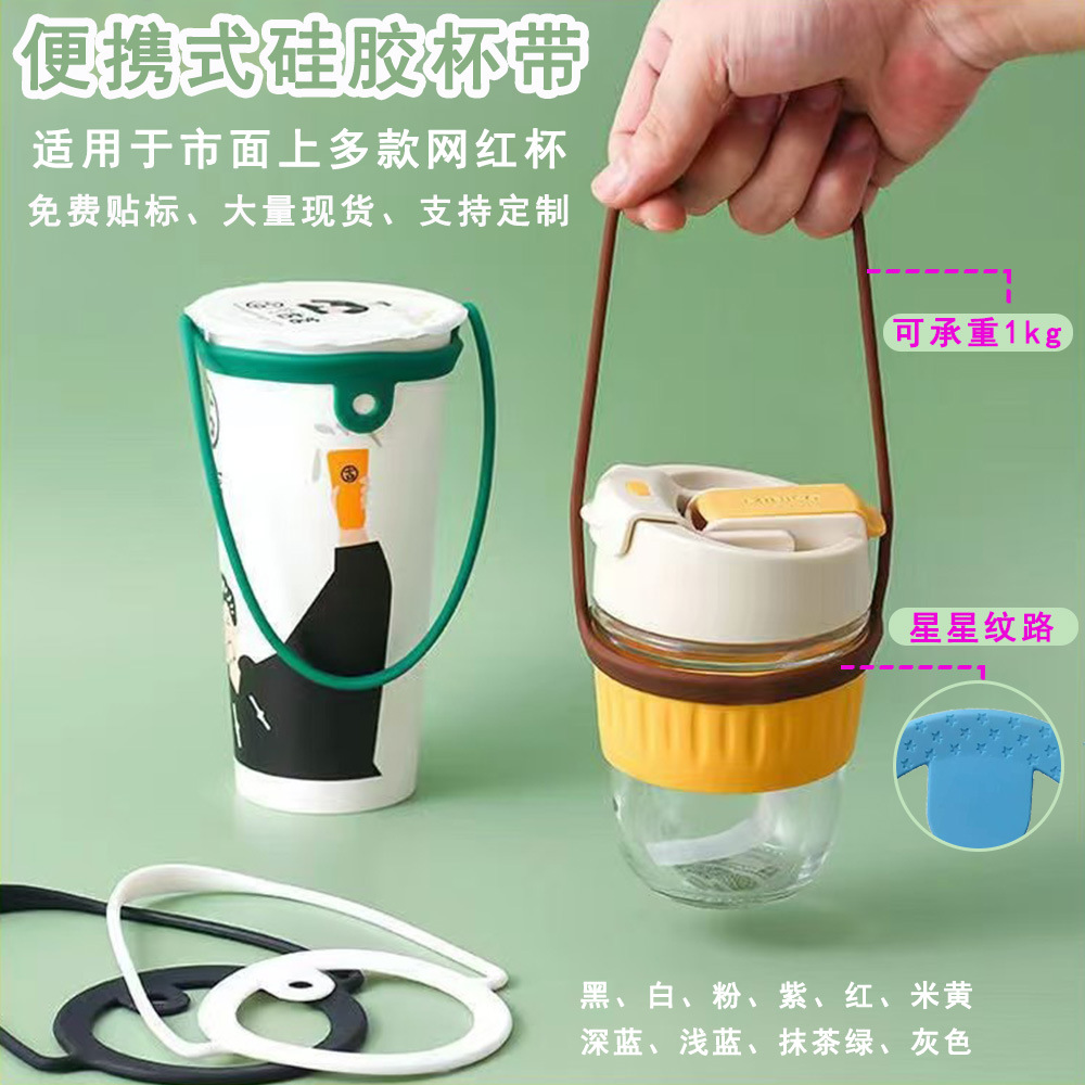 シリコンミルクティーカップハンドルカップタイダウンカップカバーの国境を越えた特別供給、印刷可能なコーヒーカップ識別子付きのポータブルストラップ付き