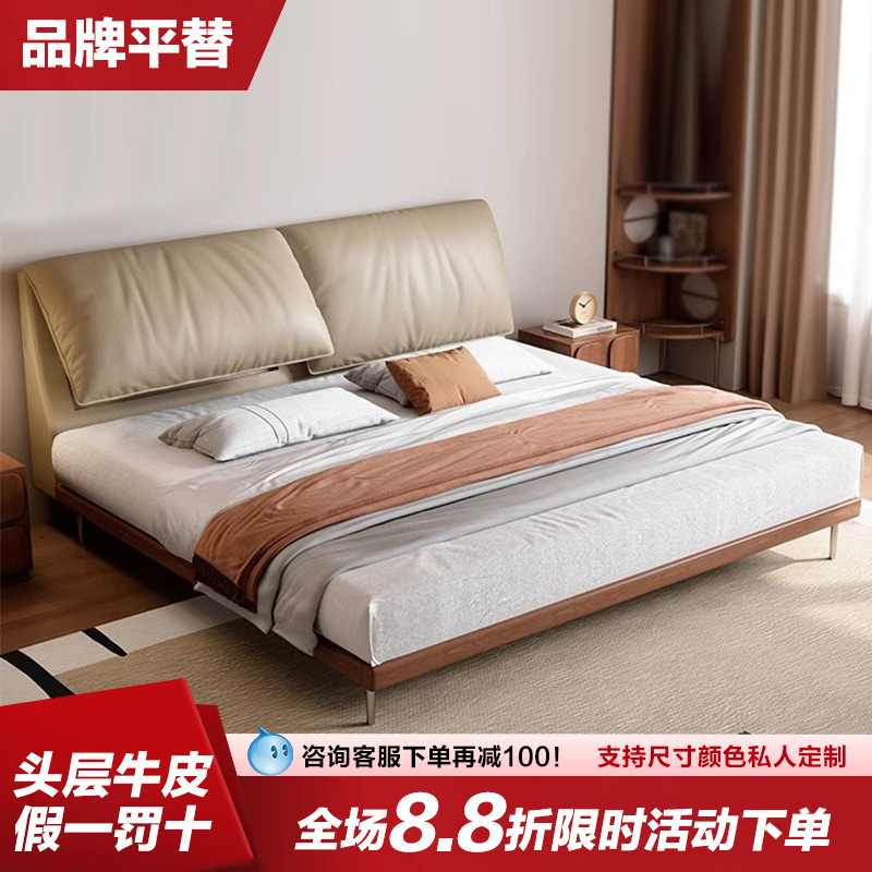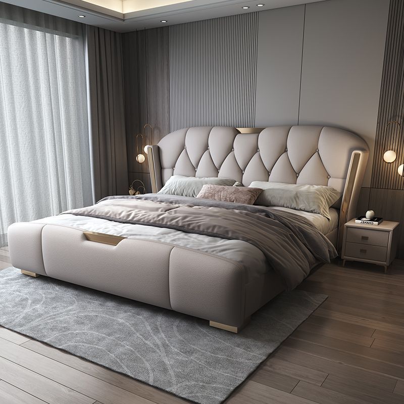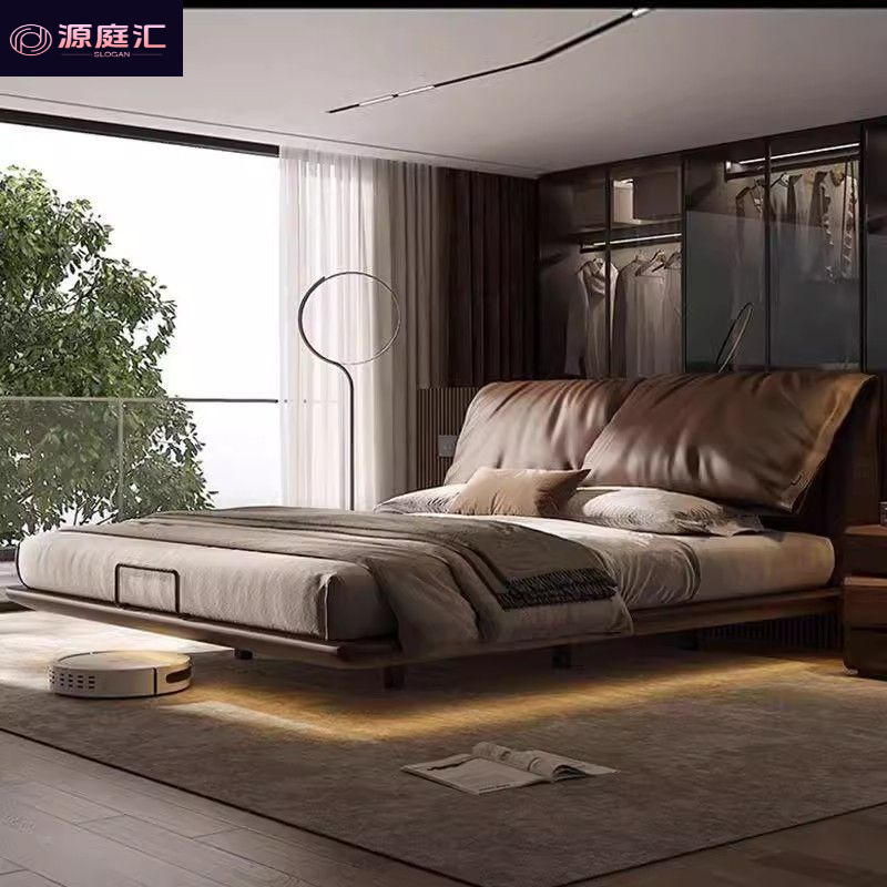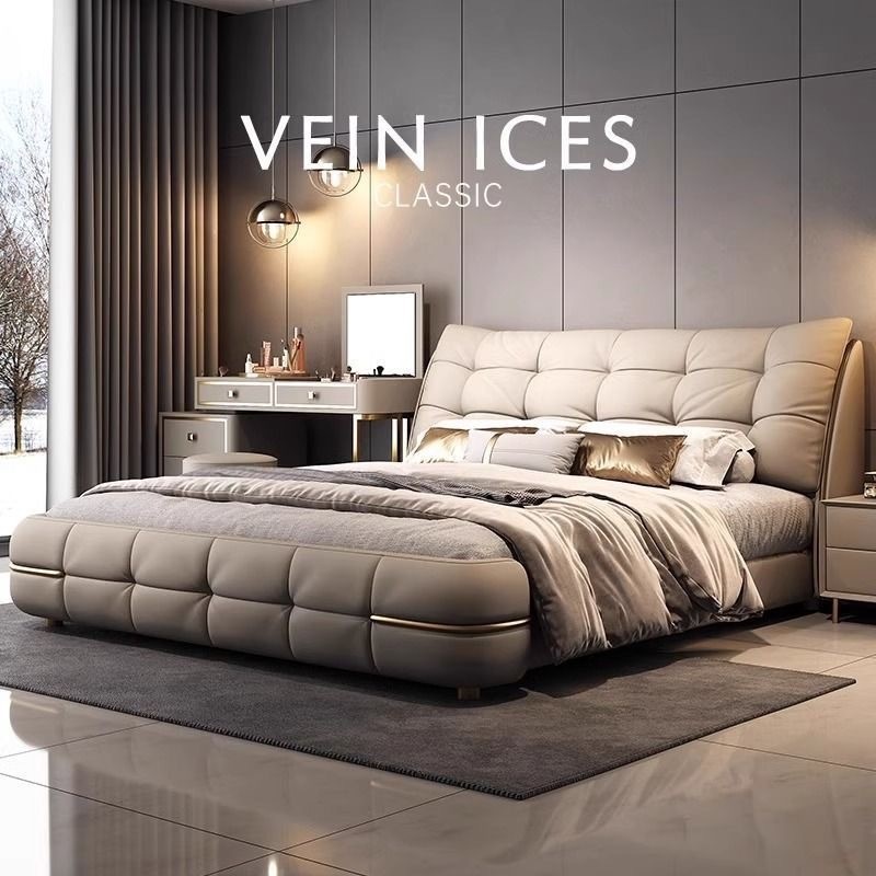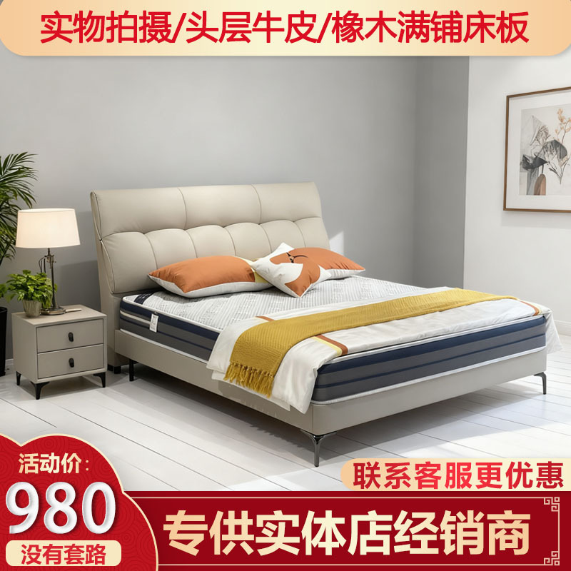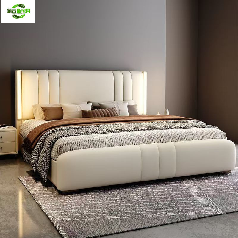 2025年新型本革ベッド、高級主寝室用大型ベッド、一層牛革オーク材ベッドボード、軽奢風両面縁取りダブルベッド、結婚用ベッド