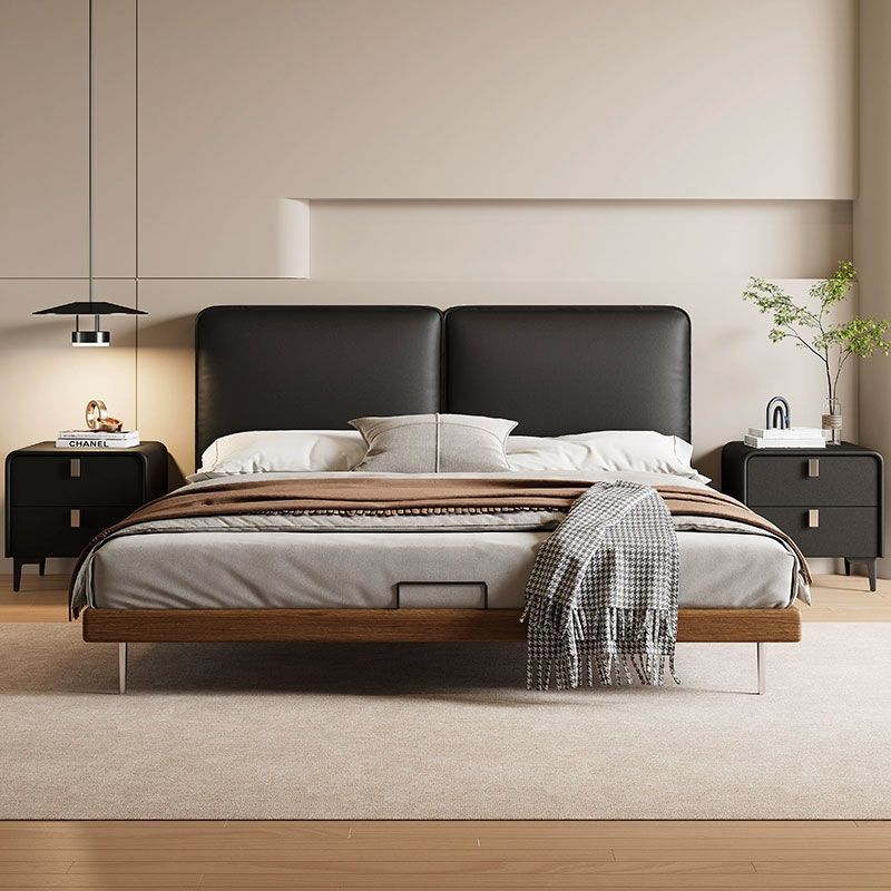 黒巧真皮ベッド黒復古中古風小戸型主臥軟包斉辺意式極シンプル白蝋木結婚ベッド
