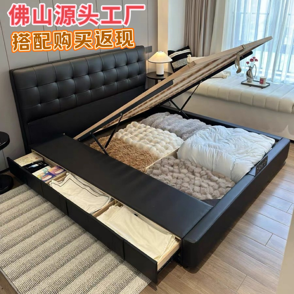 小黒牛真皮ベッド現代シンプル主臥湯葉ベッド1.8メートルの高さの箱に収納された収納ベッドの超薄ベッド