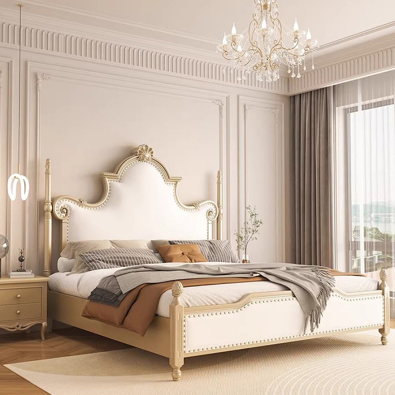クリーム風のハイエンドの皮のベッドは実木の北欧の現代の簡単で軽い豪華なフランス式の復古の主な寝台の2人の結婚のベッドを掛けます。