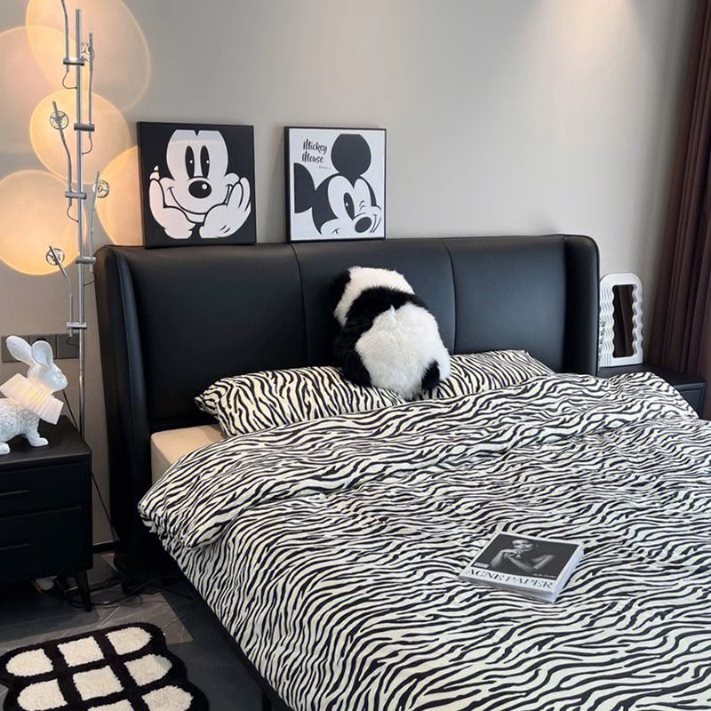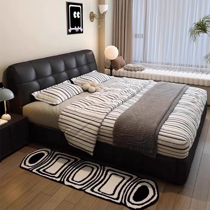 黒巧真皮ベッド黒復古中古風小戸型主臥軟包斉辺意式極シンプル白蝋木結婚ベッド