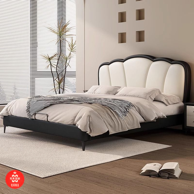 本革貝殻古風極簡主臥ダブルベッドシンプル白蝋木斉辺ダブルベッド黒