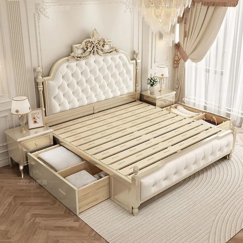 クリーム風のハイエンドの皮のベッドは実木の北欧の現代の簡単で軽い豪華なフランス式の復古の主な寝台の2人の結婚のベッドを掛けます。