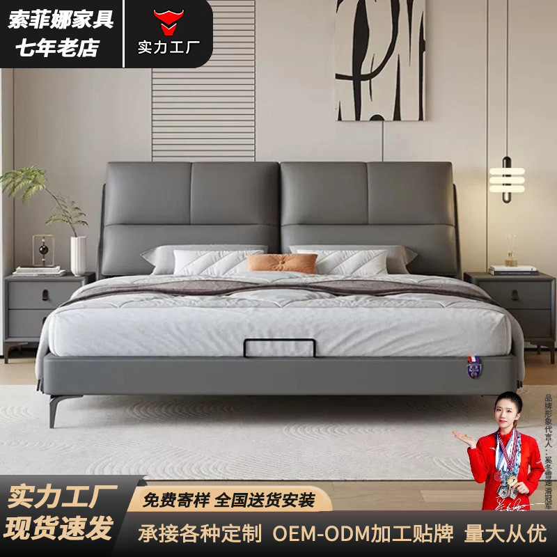 イタリア式の軽い豪華な本皮ベッドの主なベッド2023新型の現代の簡単なハイエンドの大気の2人の結婚ベッドの皮芸ベッド