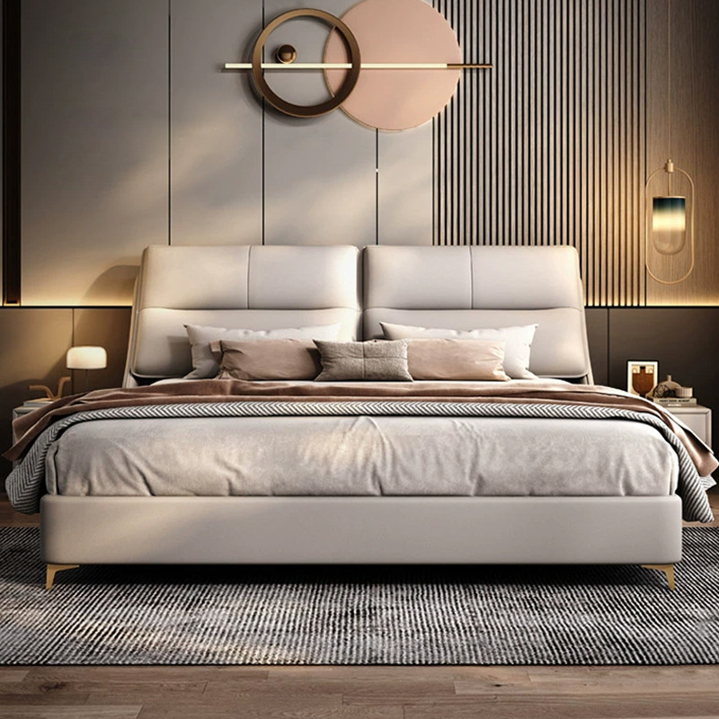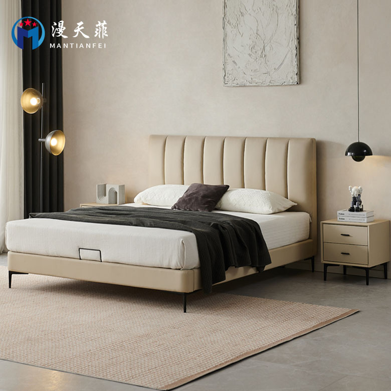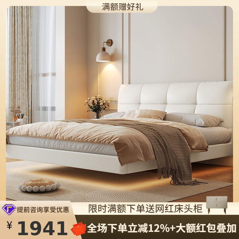 桐语特浮遊ベッド、ライト付き、軽奢でシンプル、モダンなクリーム系、ネットで話題のダブルベッド、主寝室用、ソフトパッケージ、ウェディングベッド、本革ベッド