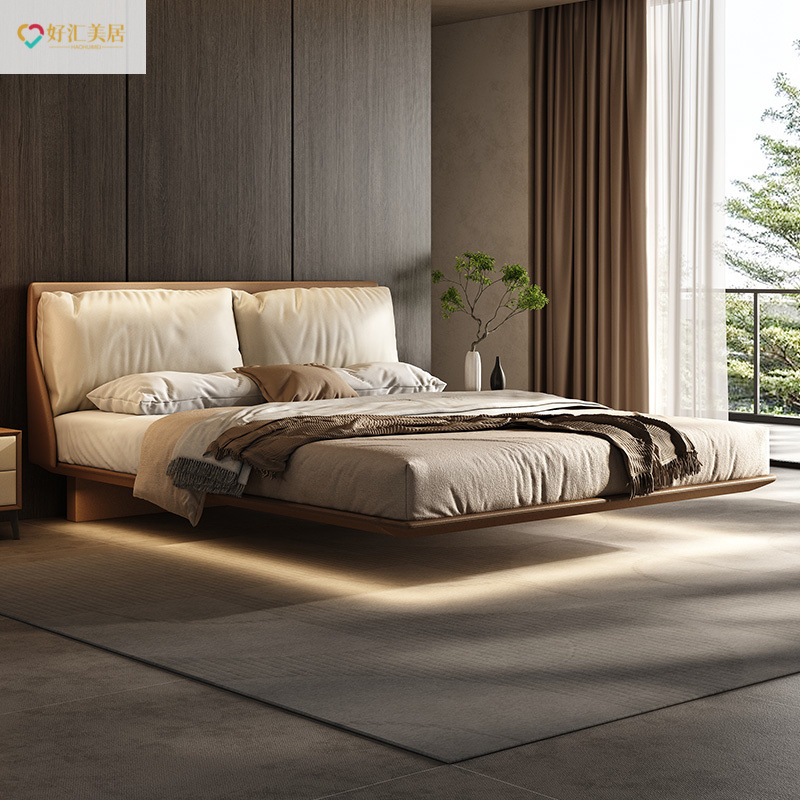 イタリアのミニマリストダブルベッドハイエンドマスターベッドルームベッドモダンシンプルな小さなアパートソフトパッケージ無垢材牛革ウェディングベッド