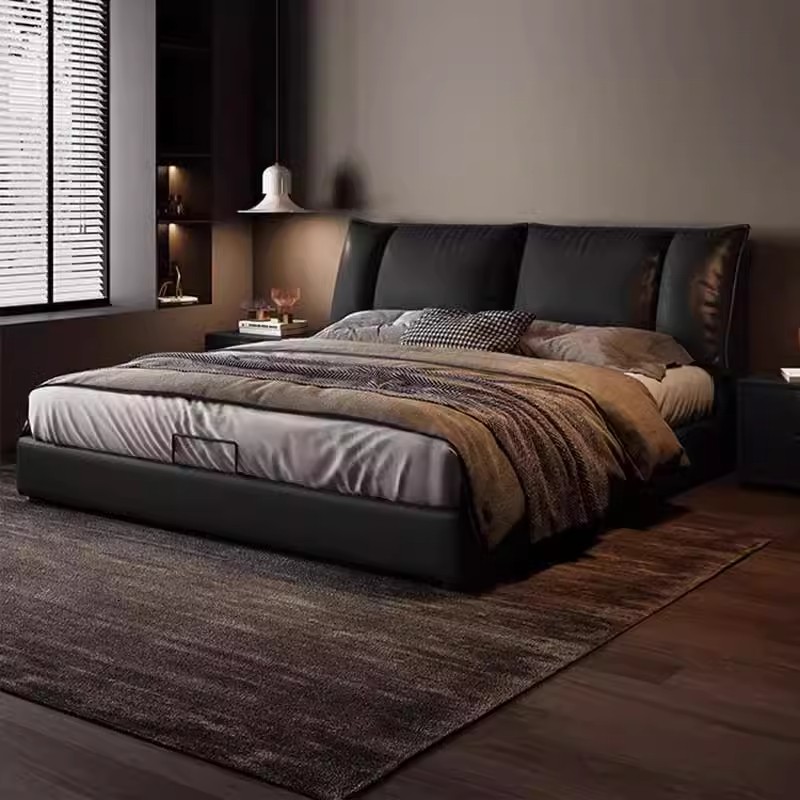 マスターベッドルーム、柔らかく雰囲気のある大きな黒いレザーベッド、モダンでシンプルなイタリアのミニマリストレトロなベッドサイドダブル本物の牛のベッド