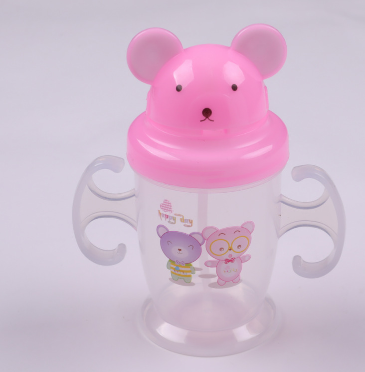 乳幼児漫画熊ストローカップ赤ちゃん学飲カップ携帯ハンドル付き背紐付きスケール子供用コップ