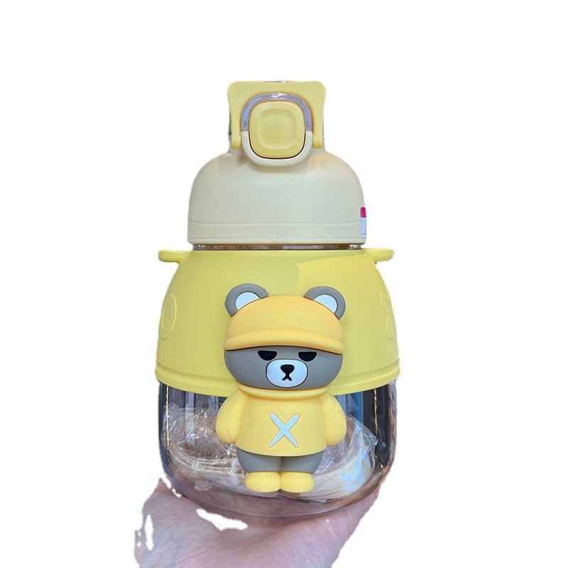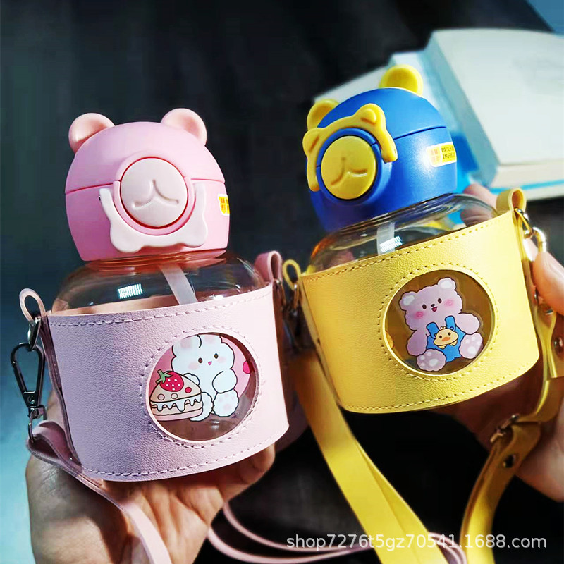 アニメかわいい熊大腹カップ子供男女コップ大容量携帯屋外ストラップ付きストローカップ1200ml