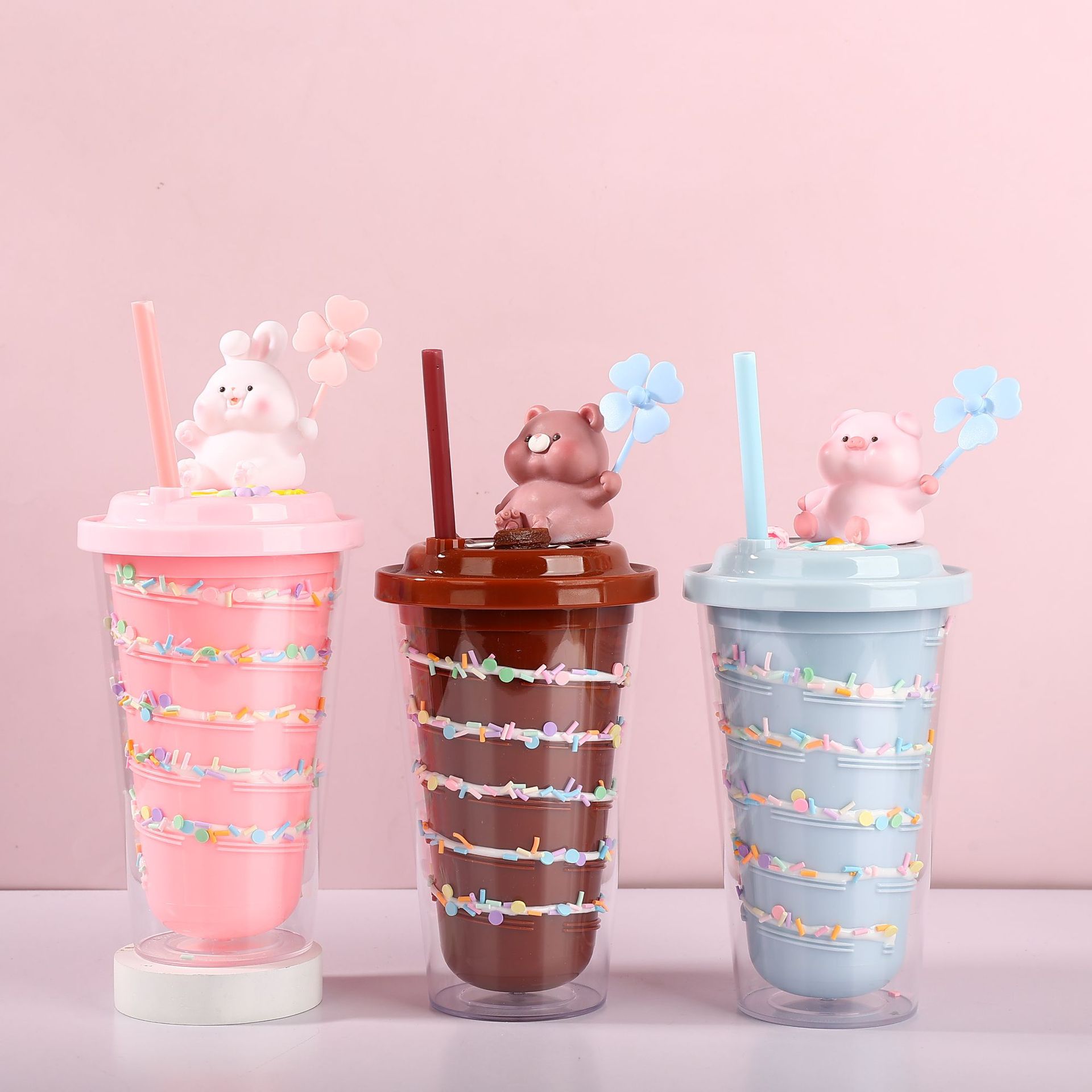 国境を越えた新型高颜値夏ネット赤萌え熊漫画ウサギプラスチックカップストローカップ二重砕氷カップ