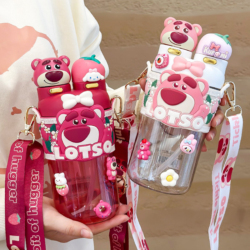 高颜値児童プラスチックカップ携帯いちご熊双飲ストラップ付きストロー水筒女子屋外ですぐにコップを飲む