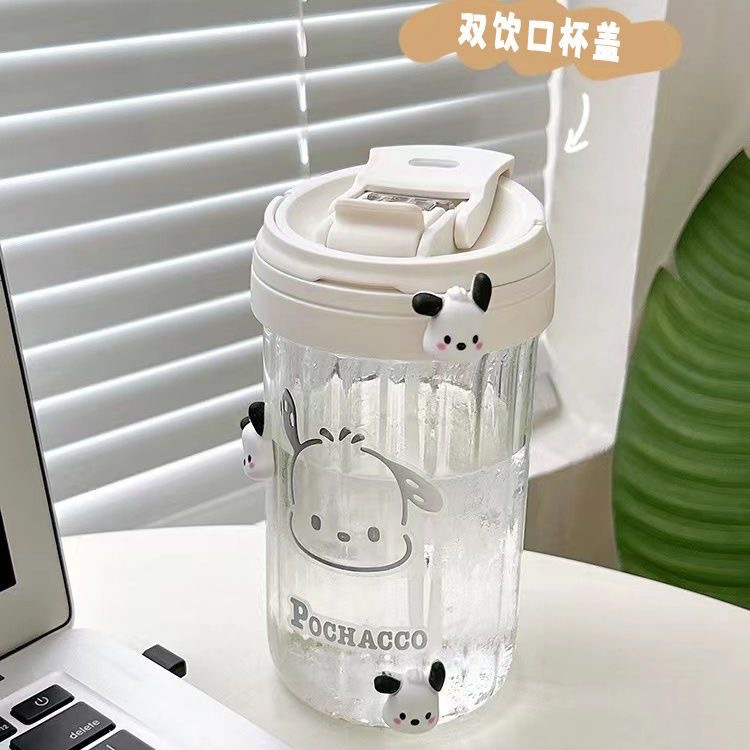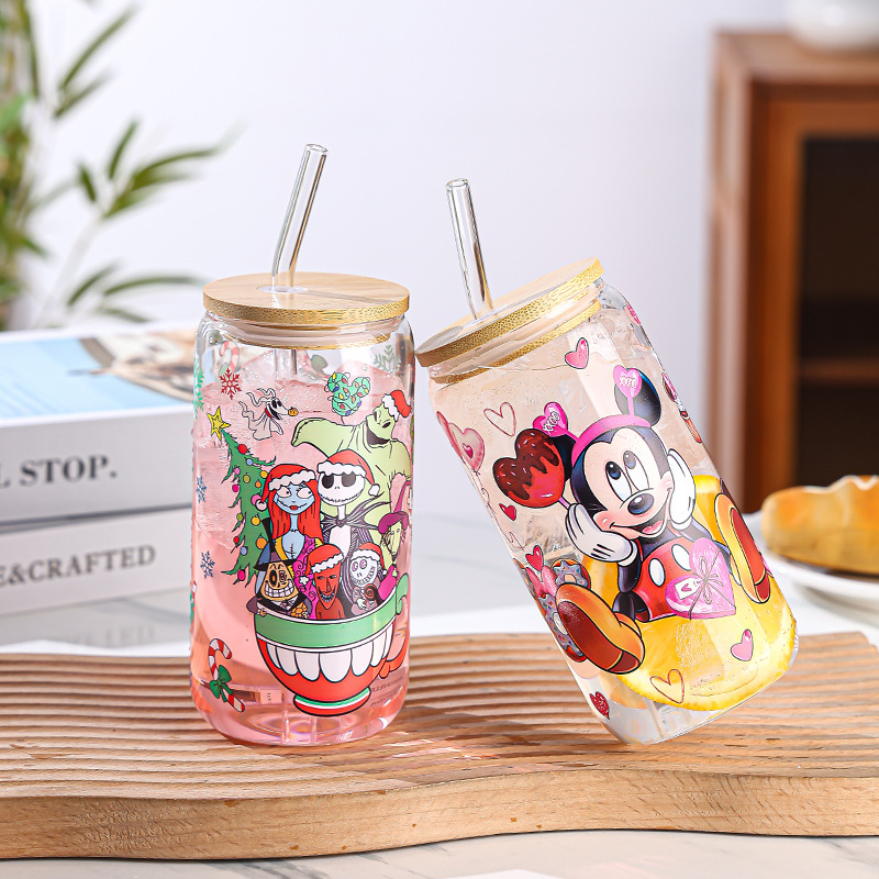 ガラスカップ漫画かわいいハンドルマグカップ蓋付きシール付き漏れ防止プレゼントシリコンストローカップ卸売り