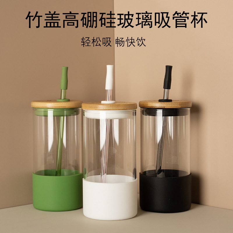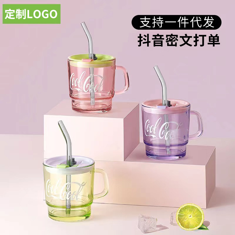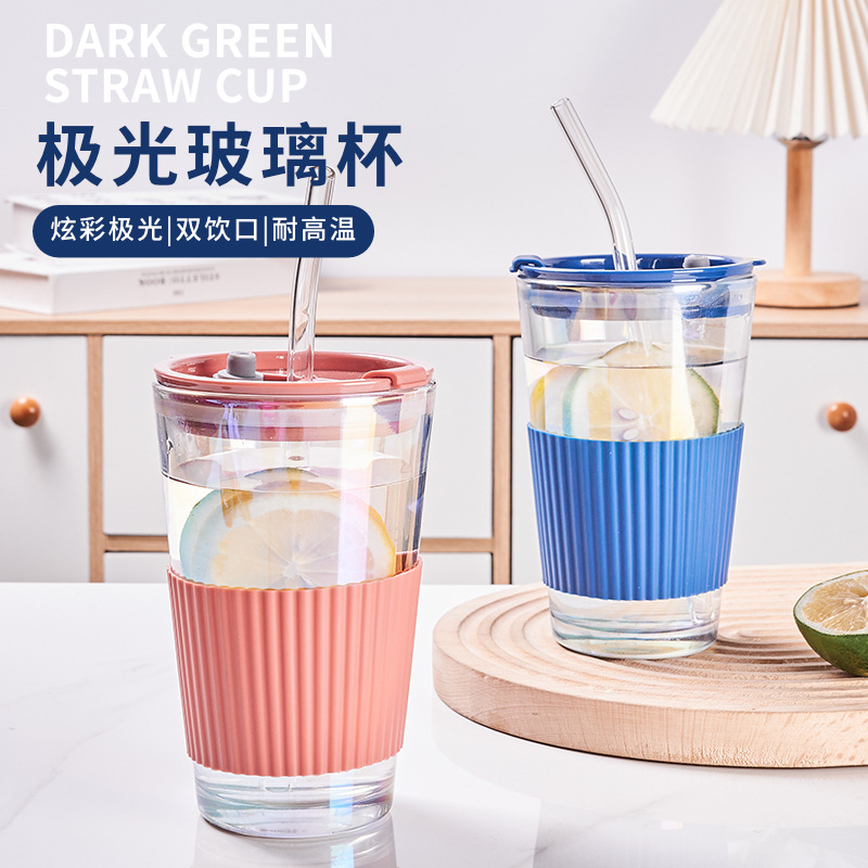 大容量ガラスストローカップ家庭用コップシンプル蓋付き携帯オフィスカップカップルカップコーヒーカップ女