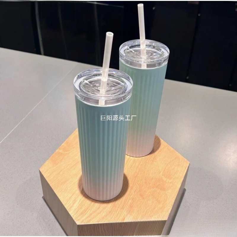 新型グラデーション色ストローカップステンレス保温カップ男女ファッション携帯車載コーヒーカップ屋外グラデーションブルー