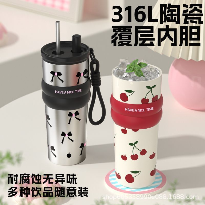 316ステンレス鋼アイスカップ大容量車載セラミックコーヒー随行カップ高颜値子供ストローコップ