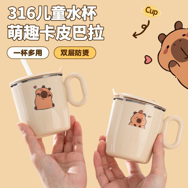 316 ステンレス鋼子供用ウォーターカップ二重層抗火傷カピバラ幼稚園ベビー飲料ミルクカップハンドル蓋付き
