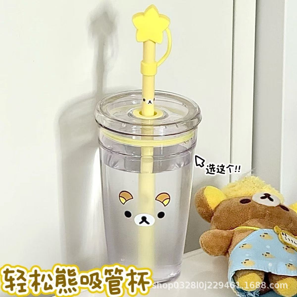 かわいい漫画リラックマインスタイル高価値ストローカップ夏の学生ホームオフィス透明プラスチックウォーターカップ