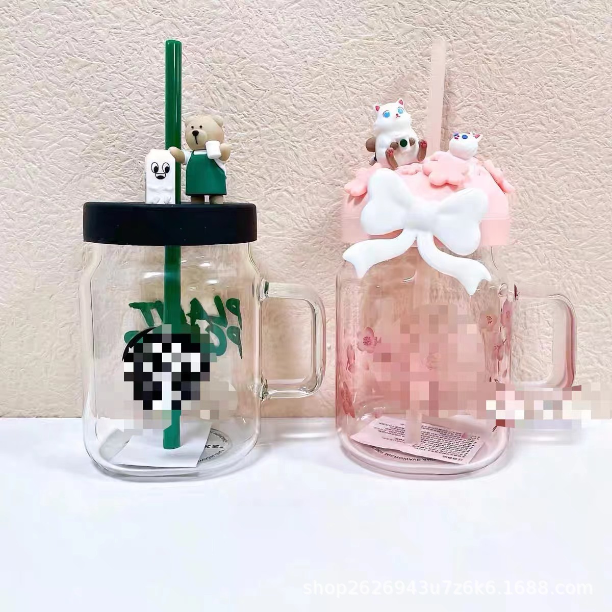 星の緑のエプロンの熊のストローカップのピンクは桜の萌え猫の蝶結びのメイソングラスのストローカップを鑑賞します。