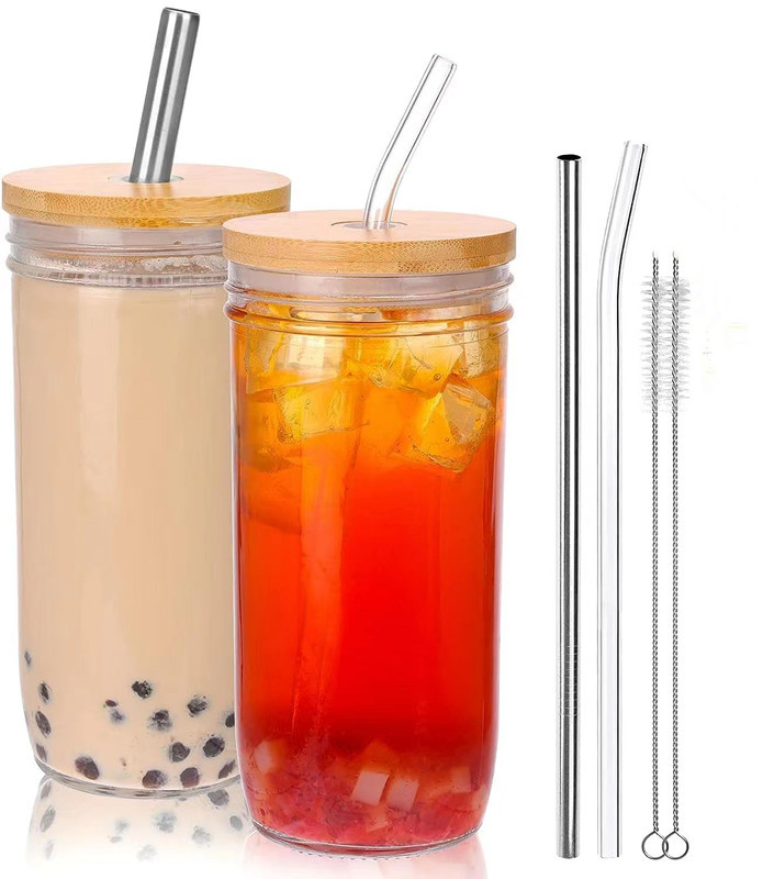 アマゾン カバー付きジュースグラス 冷たい飲み物用グラス メイソンジャー風ガラス瓶 ミルクティー ストローカップ 竹製 携帯用